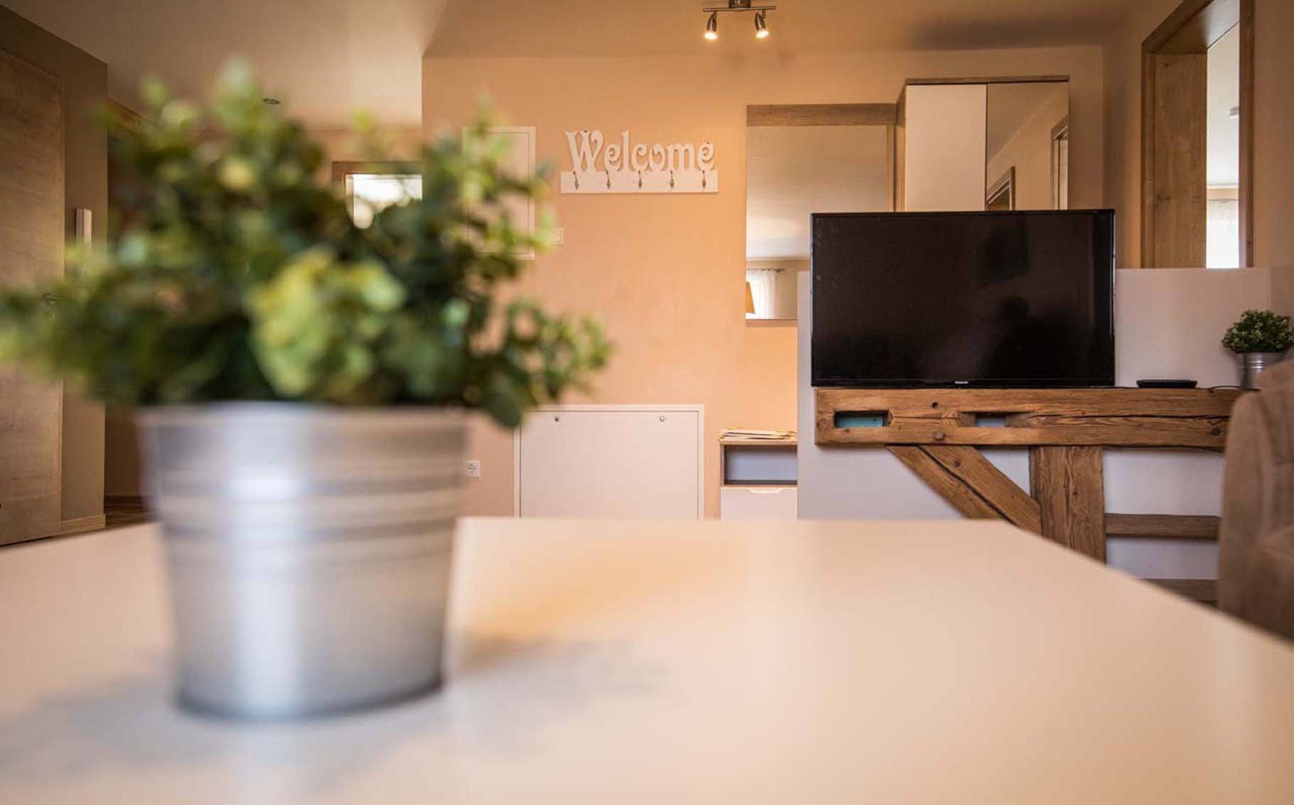 Sofa, Esstisch, TV, Kinderhochstuhl, Fußbodenheizung, Fenster, Ceran-Kochfeld, 4-Plattenherd, Backofen, Mikrowelle, Kühlschrank, Geschirrspüler, Gefrierfach, Geschirr, Kaffeemaschine, Wasserkocher, Toaster, Handtücher, Geschirrtücher