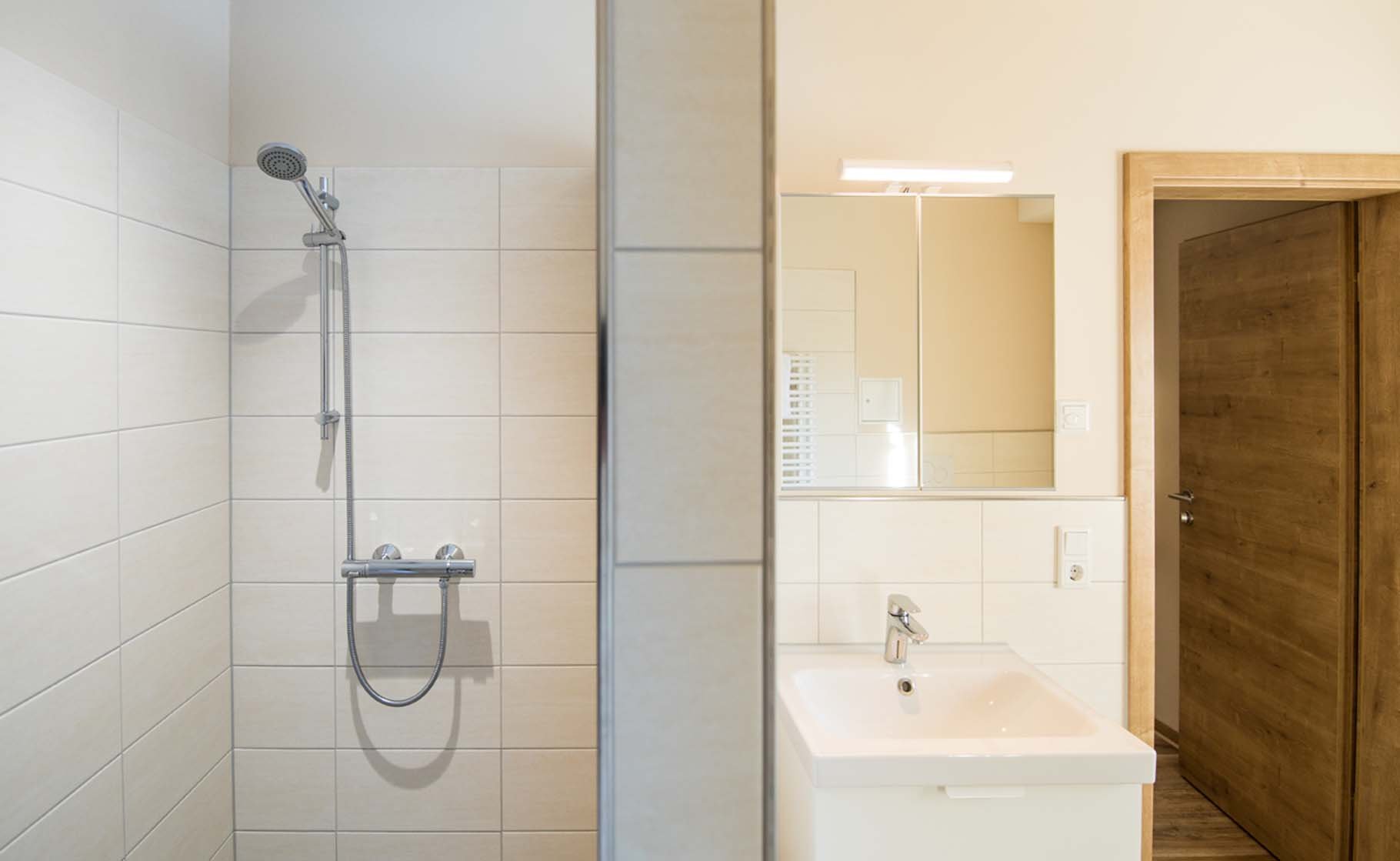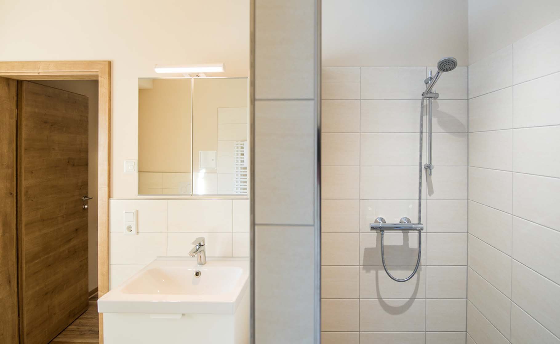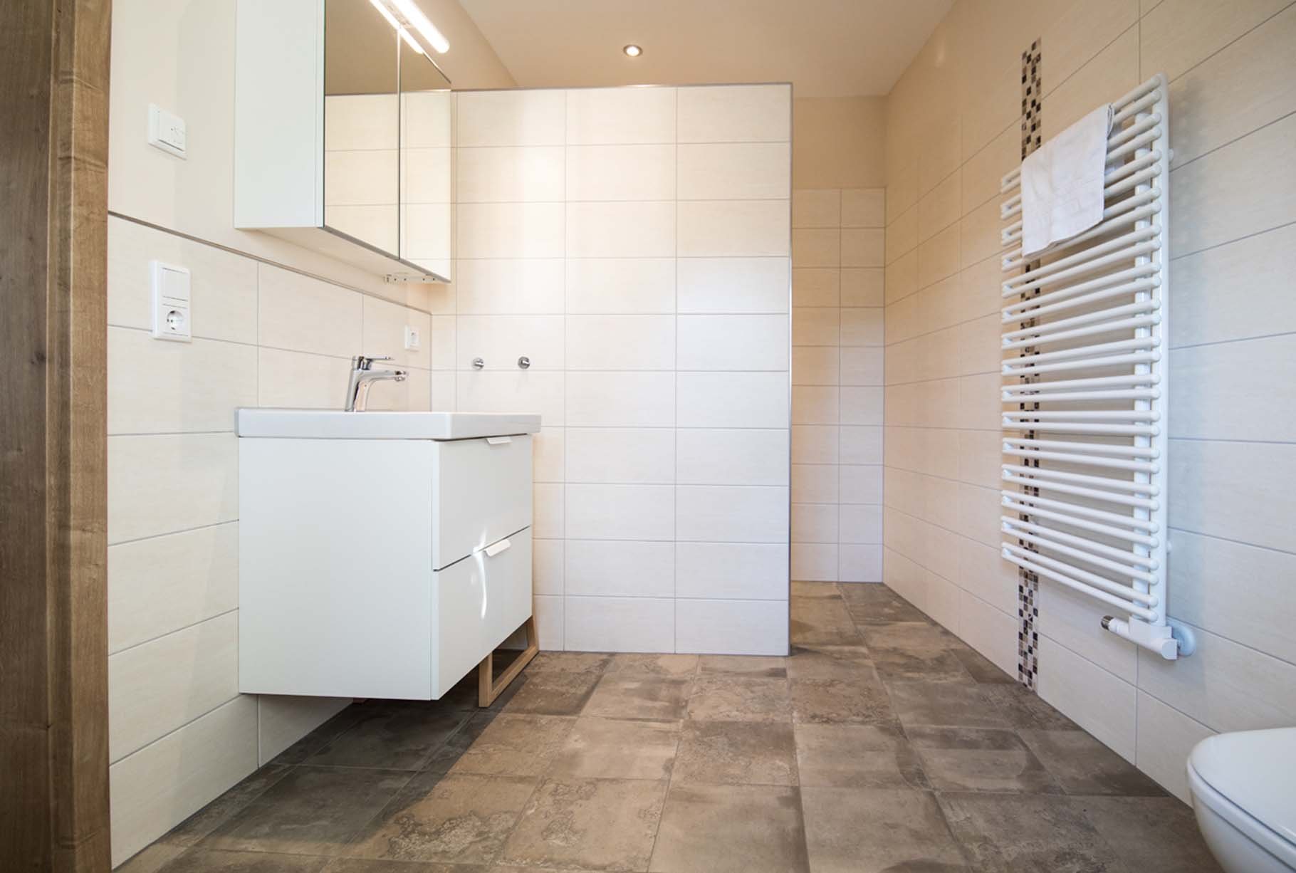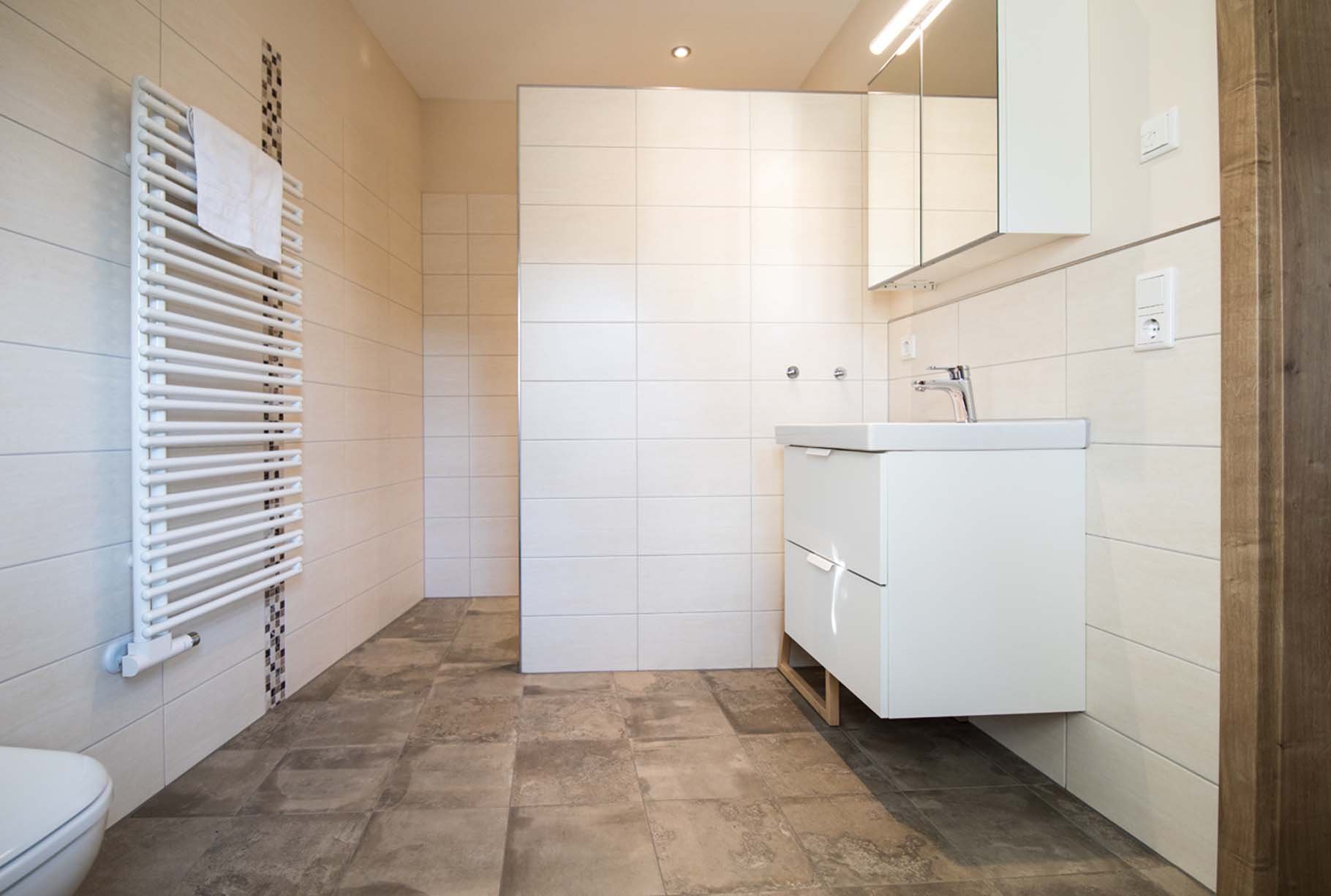 Dusche (bodengleich), WC, Waschbecken, Spiegel, Handtücher, Fußbodenheizung