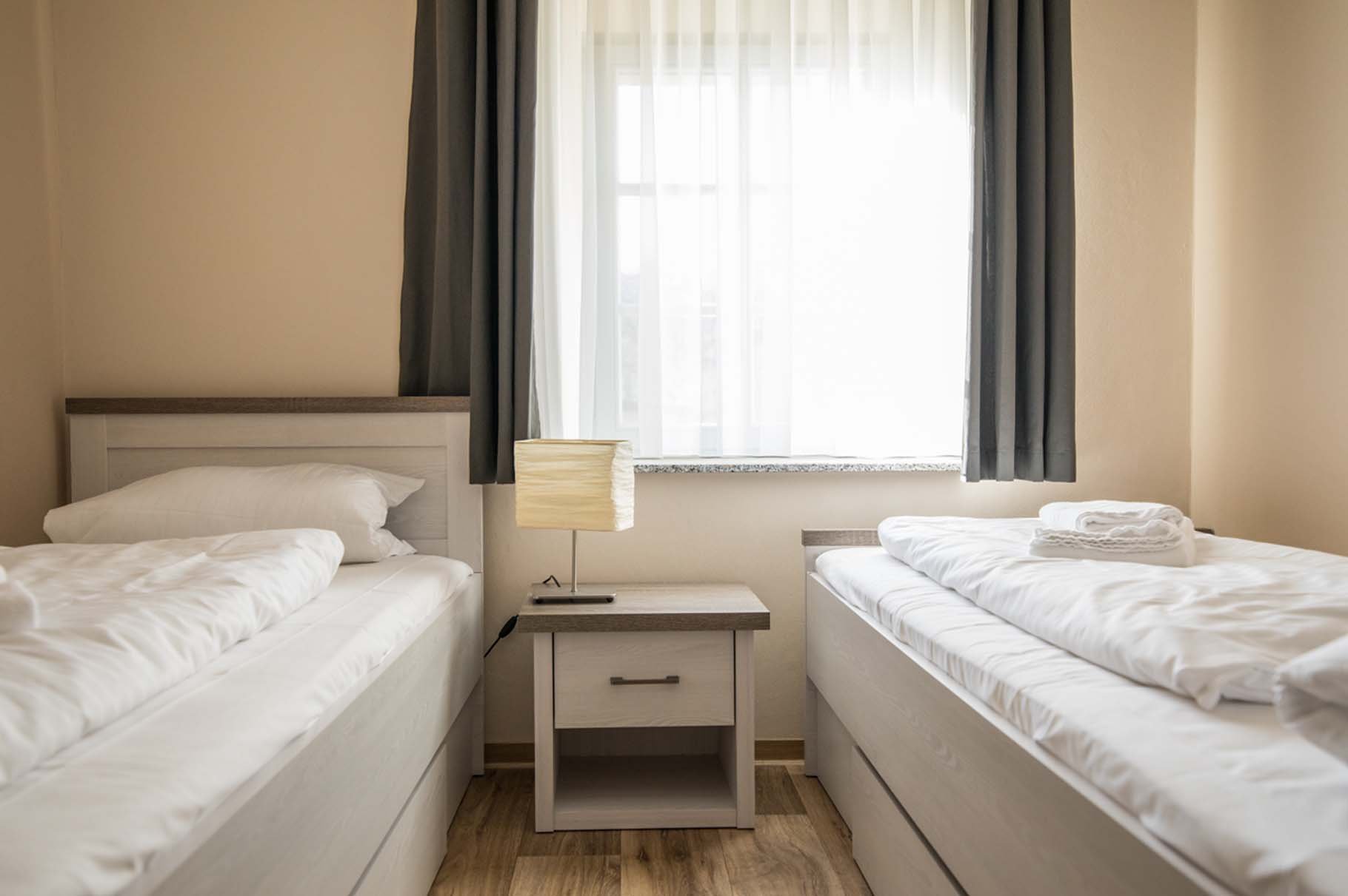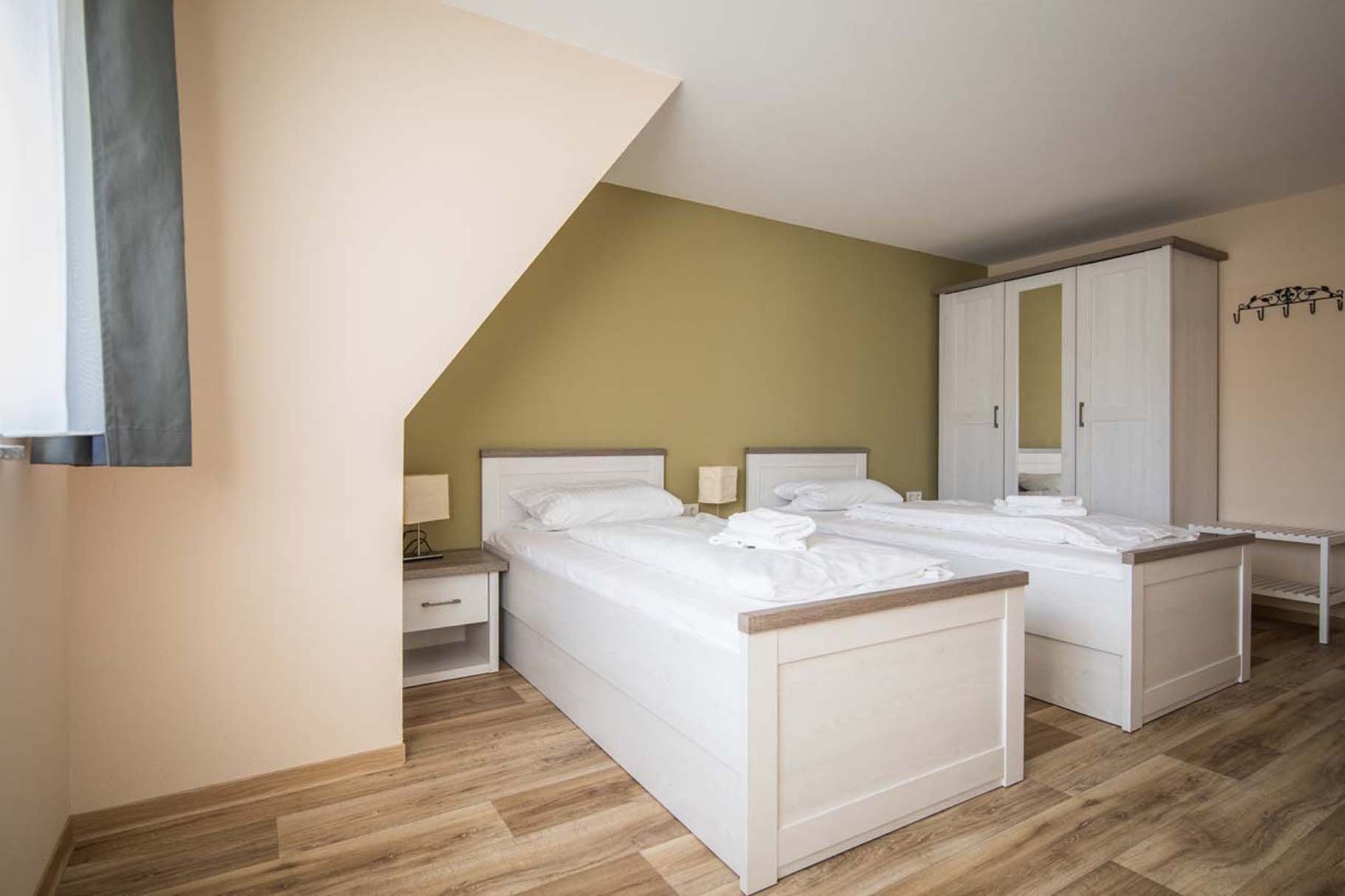 je 2 Einzelbetten, Kleiderschrank, Bettwäsche, Fußbodenheizung