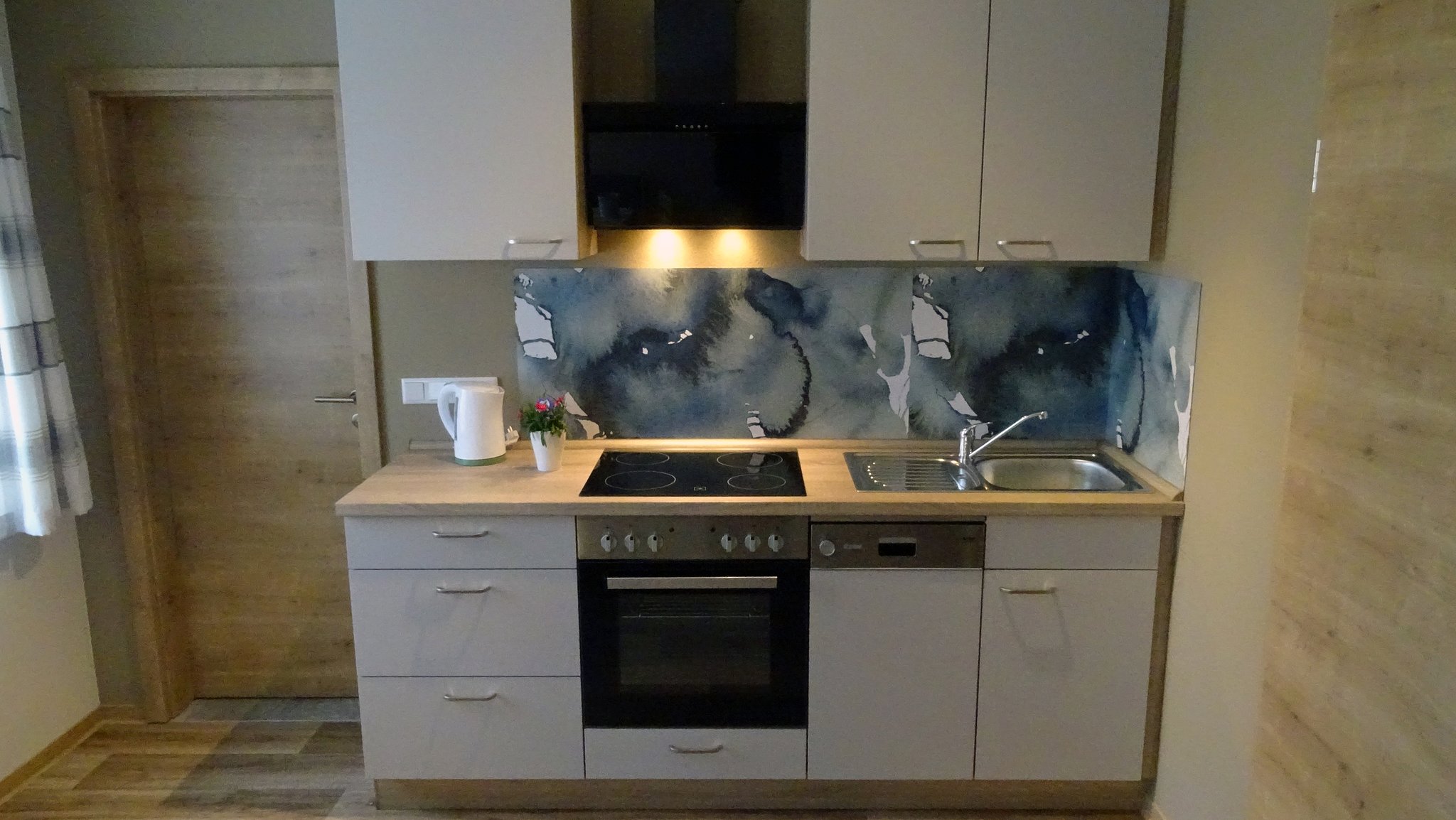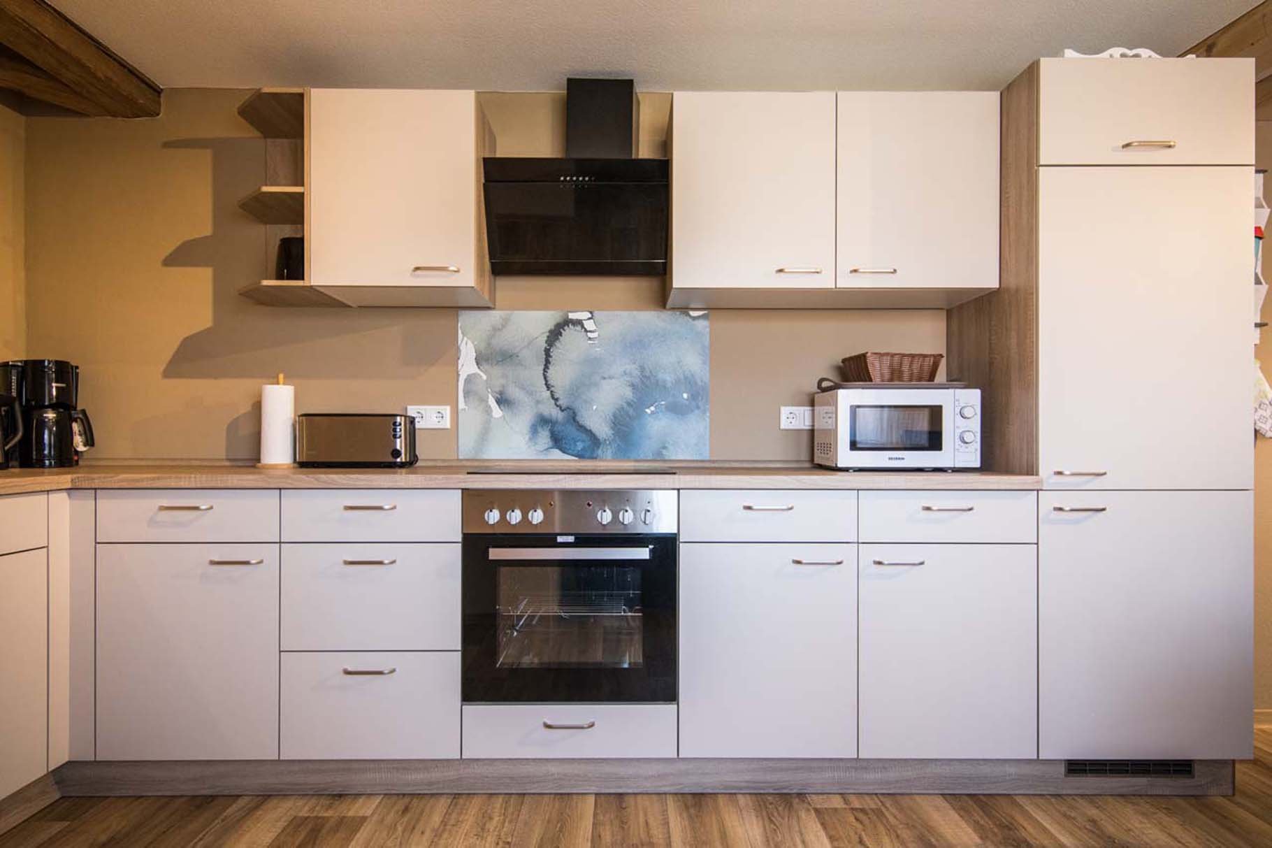 Ceran-Kochfeld, 4-Plattenherd, Backofen, Kühlschrank, Gefrierfach, Geschirrspüler, Geschirr, Kaffeemaschine, Wasserkocher, Toaster, Fußbodenheizung