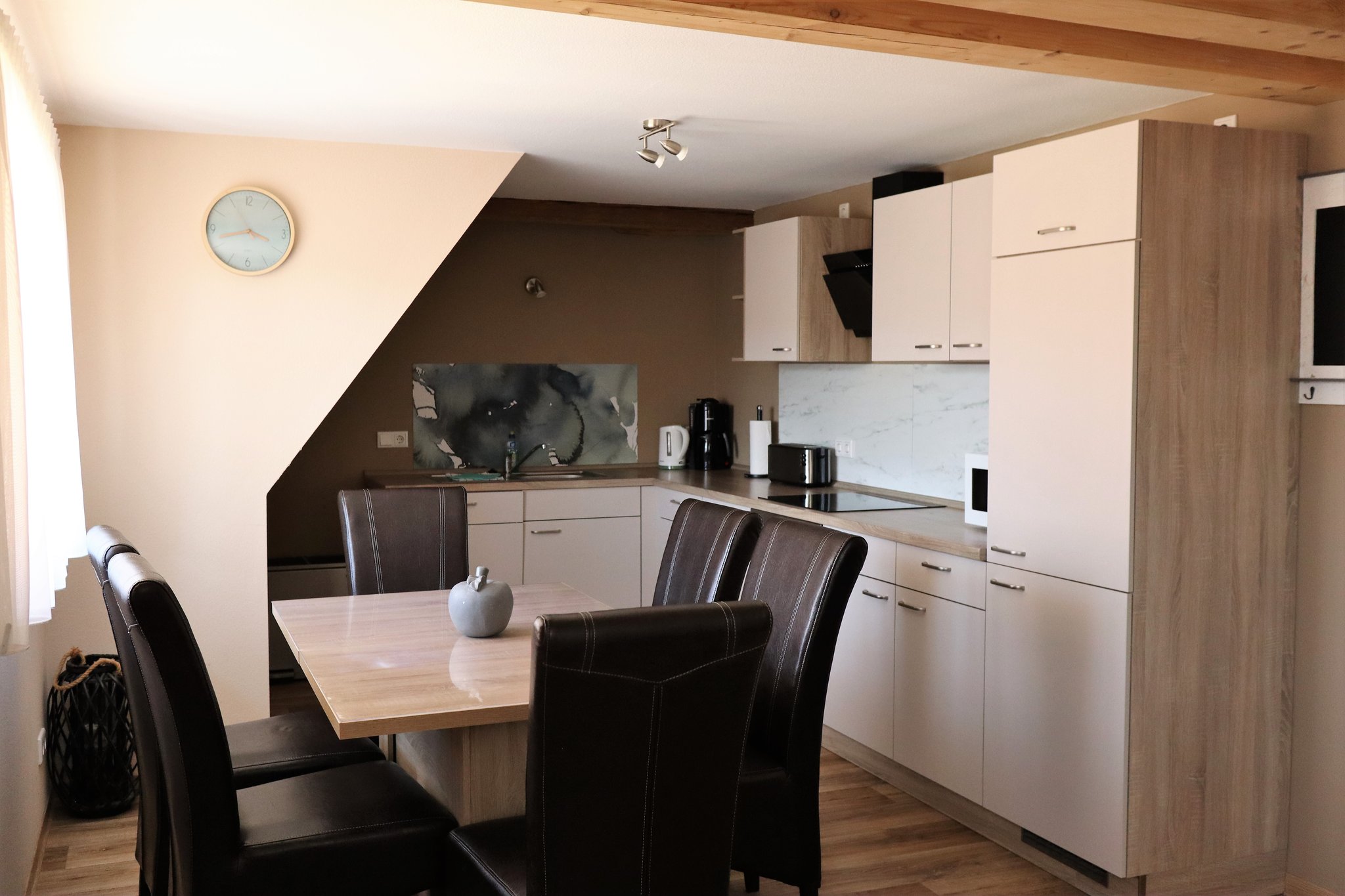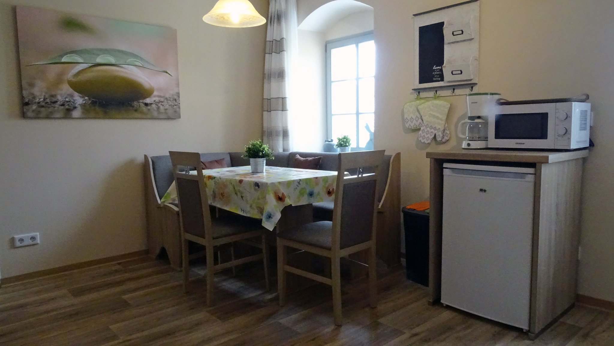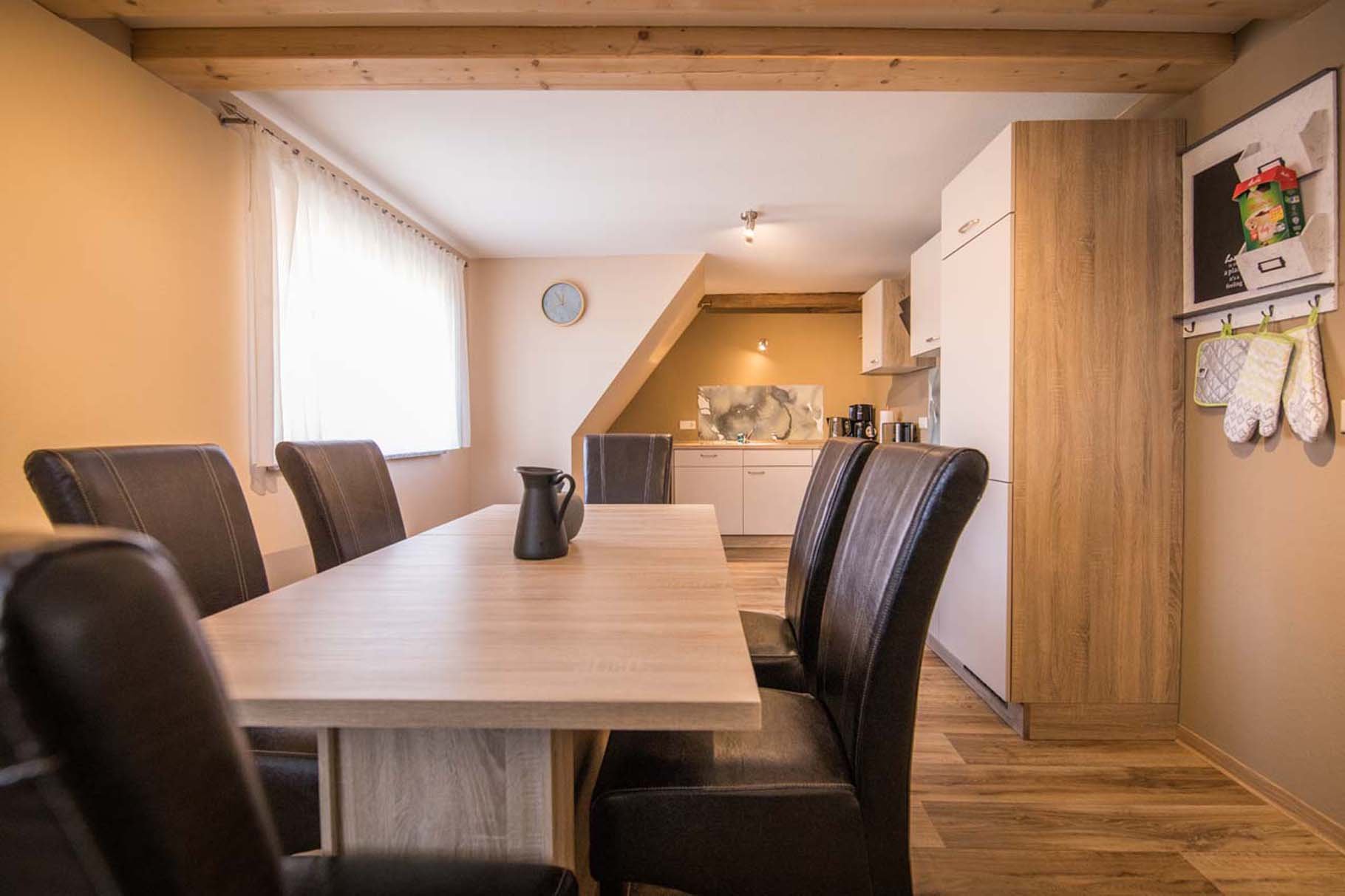 Esstisch, TV, Kinderhochstuhl, Fußbodenheizung, Fenster, Ceran-Kochfeld, 4-Plattenherd, Backofen, Mikrowelle, Kühlschrank, Gefrierfach, Geschirr, Kaffeemaschine, Wasserkocher, Toaster, Handtücher, Geschirrtücher