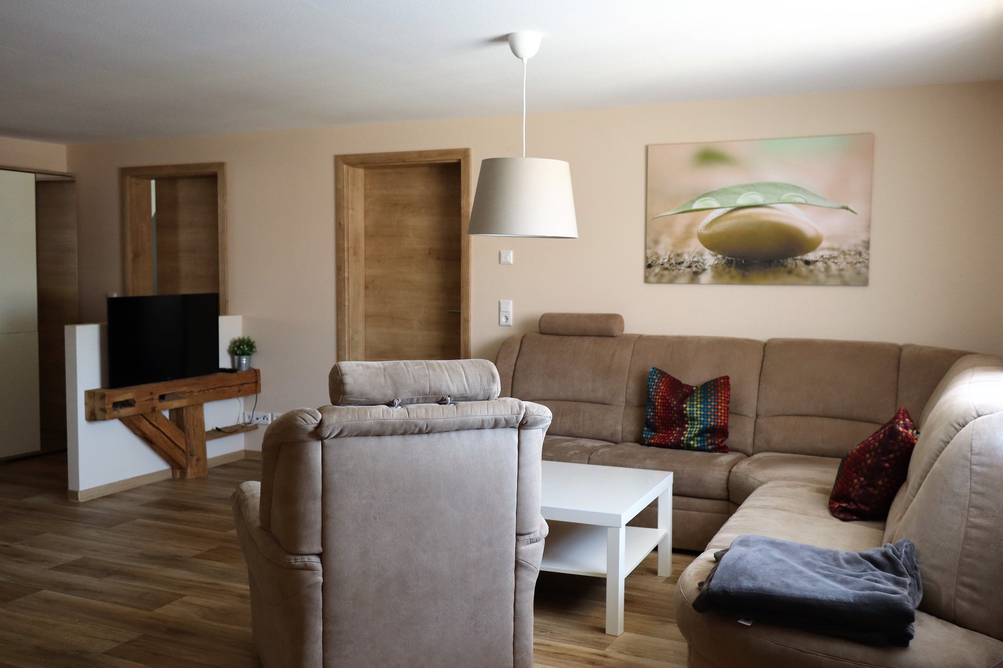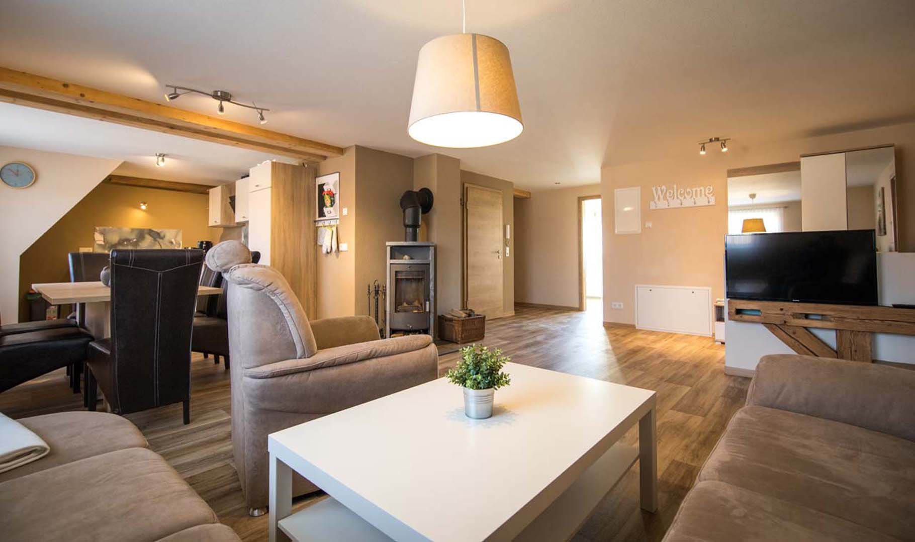Sofa, Sessel, Essbereich, Kamin, TV, Garderobe, Fußbodenheizung