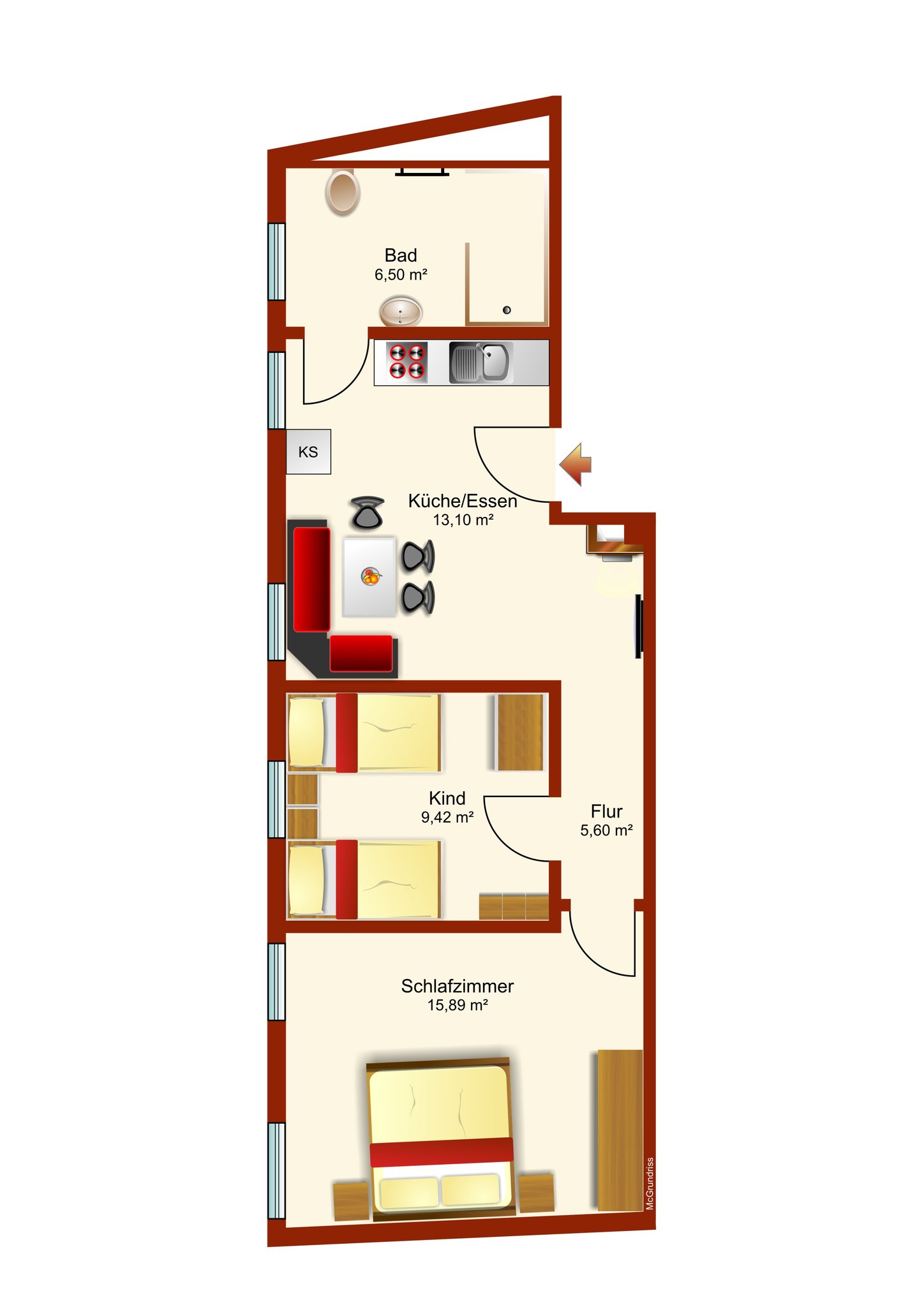Doppelbett, Kleiderschrank, Kinderbett, Bettwäsche, Fußbodenheizung